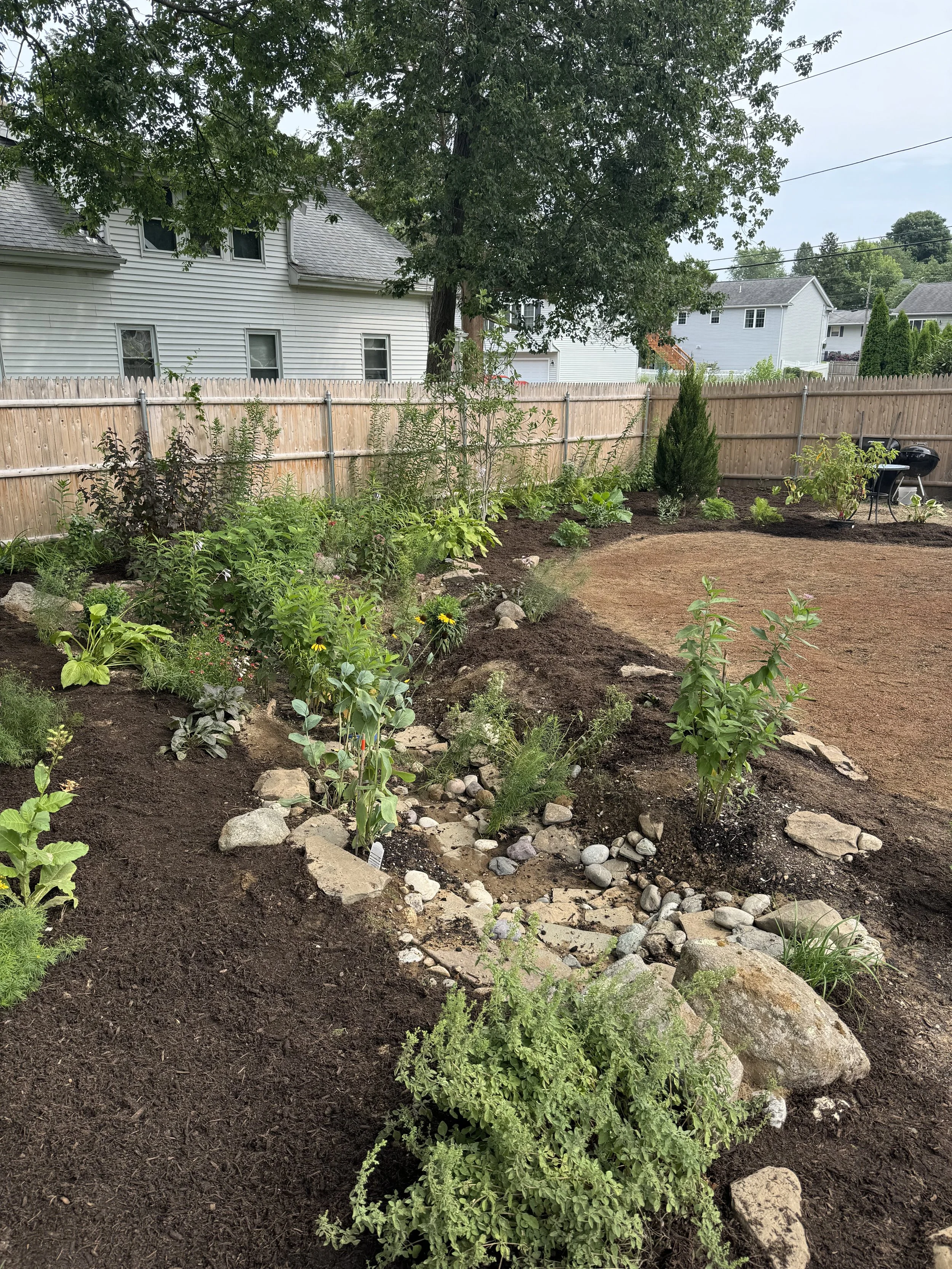 Rain gardens are designed to manage stormwater runoff on properties by capturing rainwater from roofs, driveways & other hardscapes before the water runs off site.